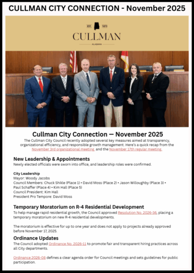Your source for city news, services, and community information. Explore our departments, find helpful resources, and stay connected with what’s happening in the City of Cullman. ¿Necesitas hablar con alguien en español? Llame al 256-775-7106 o envíe un correo electrónico.