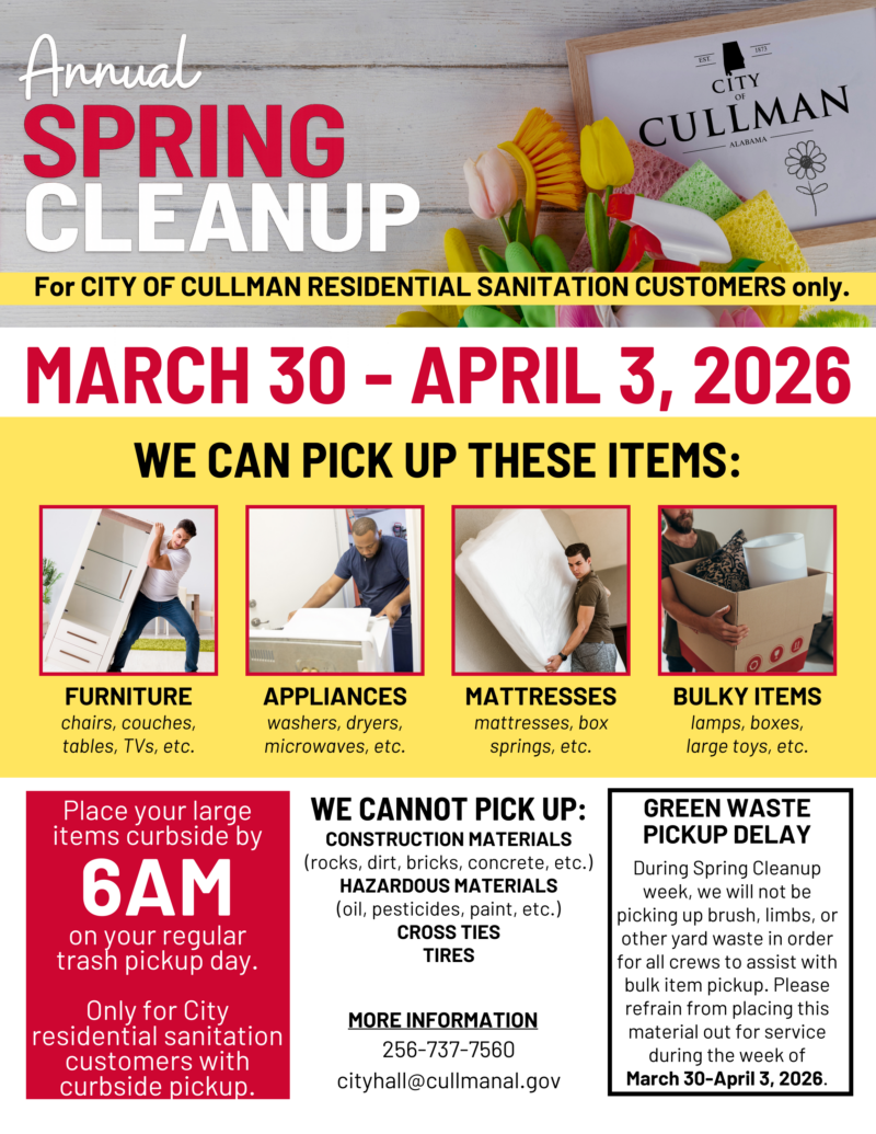 Cullman’s Annual Spring Cleanup is set for March 30 through April 3, 2026, and it’s time to clear out those large items taking up space at home. This special pickup event is available to City of Cullman residential sanitation customers with curbside service.