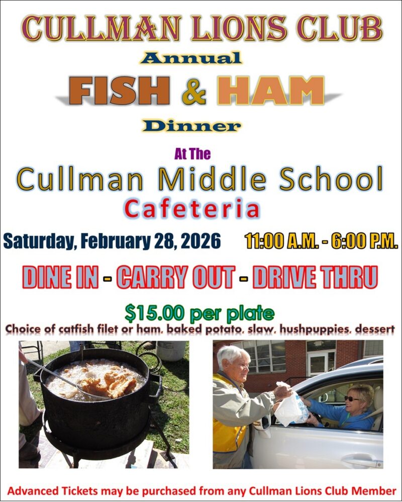 | $15.00Choice of catfish filet or ham, baked potato, slaw, hushpuppies, dessert. Tickets can be purchased from any Cullman Lions Club member.