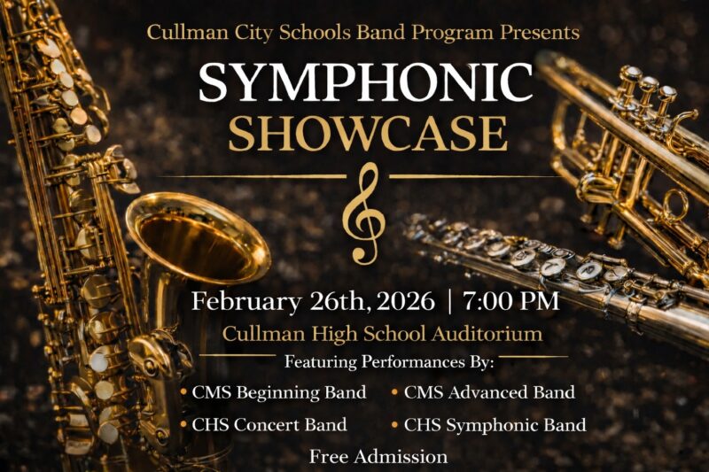 The Cullman Band will present our Symphonic Showcase Concert on Thursday, February 26th, 2026 at 7:00 PM in the CHS Auditorium. This concert will feature performances by the CMS Beginning Band, CMS Advanced Band, CHS Concert Band, and CHS Symphonic Band. Free Admission!